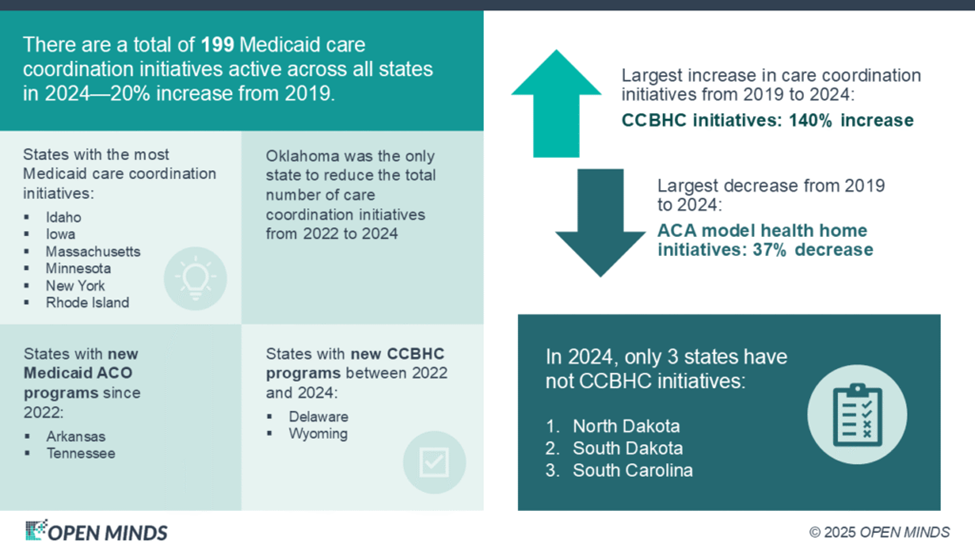 The states with the most adoptions of Medicaid care coordination initiatives are Idaho, Iowa, Massachusetts, Minnesota, New York and Rhode Island. And over the past five years, the states with the greatest increase in the number of care coordination initiatives include California, Idaho, Illinois, Iowa, Minnesota, and Rhode Island. In contrast, the states with the fewest adoptions of care coordination initiatives are Alaska, Georgia, Indiana, Kentucky, Louisiana, Montana, Nevada, New Hampshire, South Dakota, and Wyoming. Oklahoma was the only state that reduced the total number of Medicaid care coordination initiatives adopted.