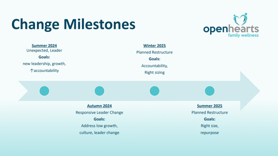 As a result of this restructuring initiative, Dr. Keck saw improved organizational performance. Open Hearts saw its turnover rate drop from 84% to 30%, increased its operating margin by 12%, and improved its employee net promoter score (NPS) by 70 points.