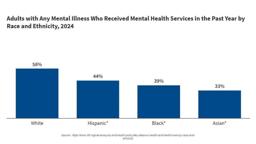 These differences in clinical outcomes can be partially attributed to health system characteristics. Roughly one-third (36%) of Hispanic adults, one-quarter (25%) of AIAN adults, and one in five of NHPI (22%) and Asian (19%) adults report not having a personal health care clinician compared to 16% of White adults. Among people under age 65, AIAN (19%) and Hispanic (18%) were more than twice as likely as their White counterparts (7%) to be uninsured. And among adults with any mental illness, Hispanic (44%), Black (39%), and Asian (33%) adults were less likely than White adults (58%) to receive mental health services.