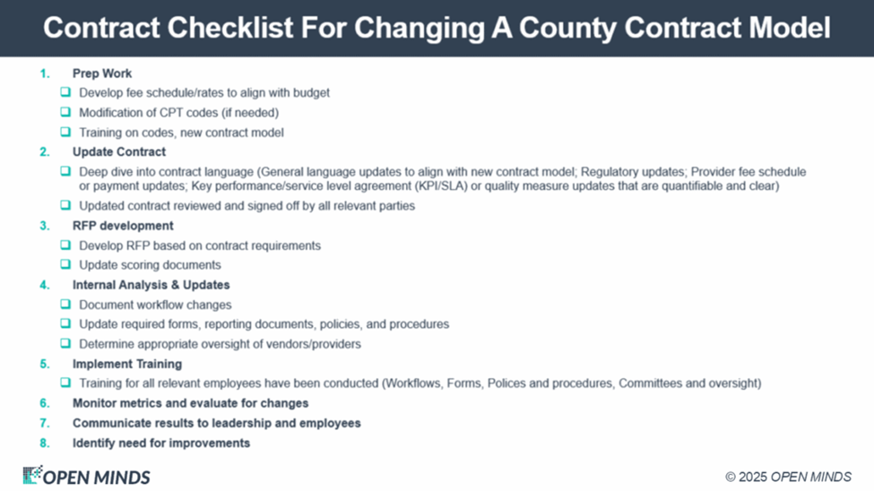 At the same time, this is an opportunity for entrepreneurial provider organizations to develop “alternative” service models to meet the needs of county government and their citizens. Many forward-looking county executives are redesigning their service delivery systems for behavioral health, child welfare, senior services, housing, and more. Provider organization viability will depend on understanding how counties interpret Medicaid rules, enforce licensure and documentation standards, and structure oversight, even when counties are not the direct payer.