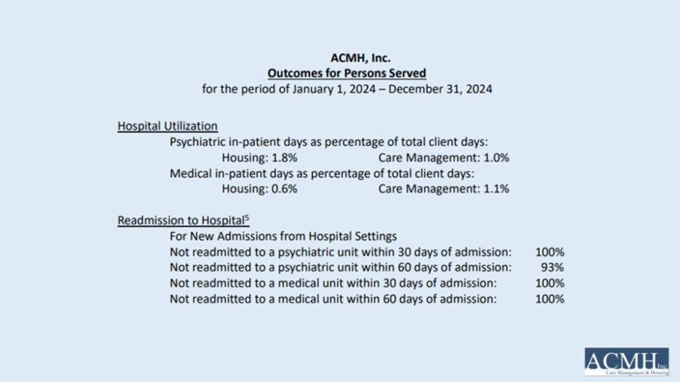 The ACMH team has invested in a performance measurement system to assess the impact of their housing initiatives on health care utilization. For clients with ACMH supported housing, inpatient days were less than 1% of total days. And for those admitted, their 30-day admission rate was 0%âand their 60-day readmission rate was 7%.