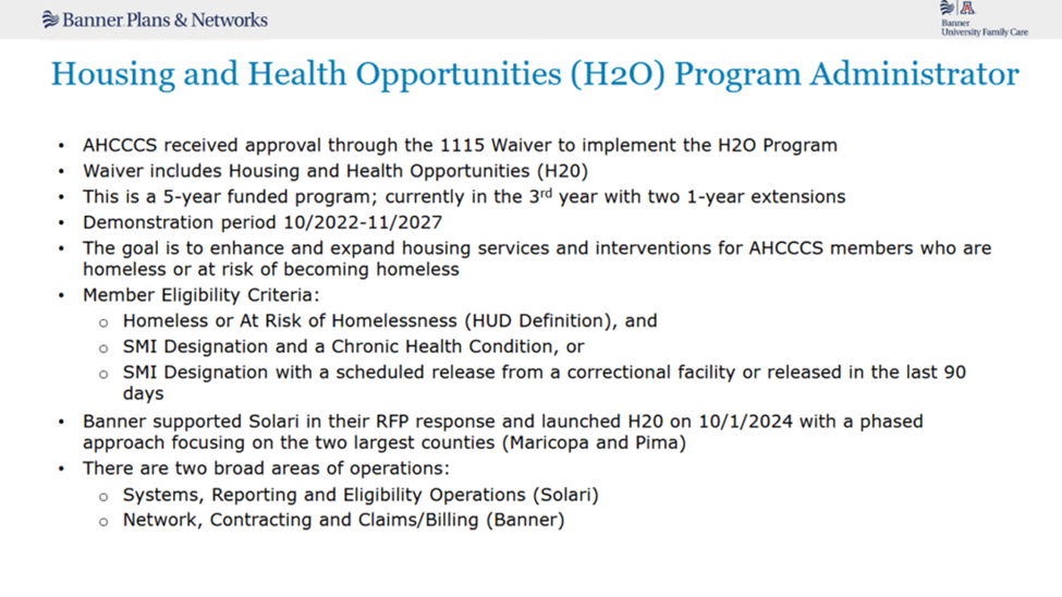 In response, AHCCCS applied for the 1115 waiver to create the Housing and Health Opportunities (H2O) program to complement AHP. Solari and Banner Health Plans serve as program administrators, with the demonstration period running through November 2027. Banner is responsible for network management; billing and claims; fraud, waste, and abuse; and contracting.