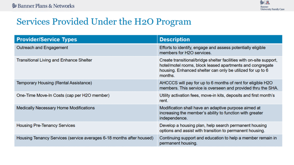 H2O provides transitional living services for a AHCCCS members who are homeless or at risk of homelessness and who have SMI and either a chronic health condition or are scheduled for release from a correctional facility or released in the last 90 days. This includes hotels, motels, block-leased apartments, and congregate housing. H2O pays up to six months of rent and one-time move-in costs, such as utility activation, deposits, and first monthâs rent. They also make any medically-necessary home modifications. Since 2024, 536 members have been designated for H2O, with 34 members successfully housed as of mid-2025.