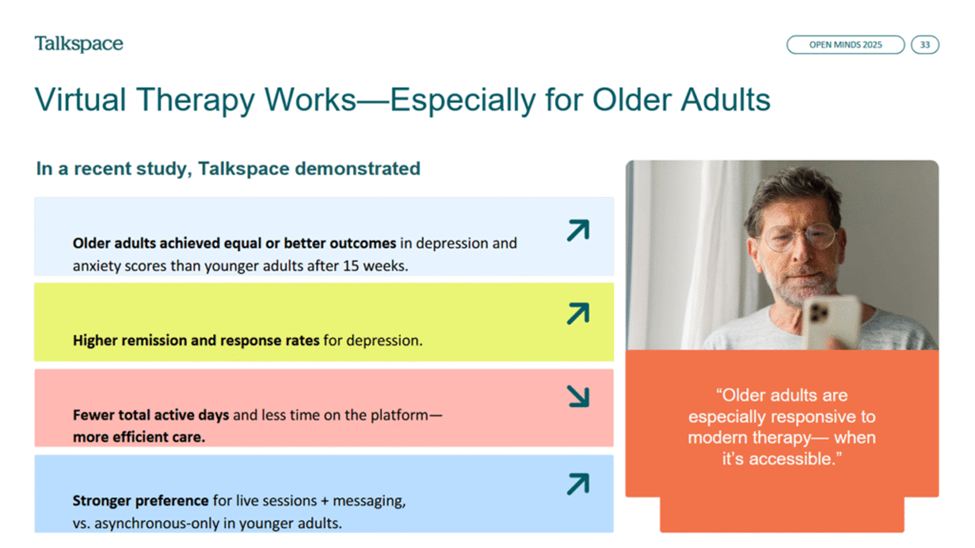 To meet these seniors where they are, Talkspace is now offering AI‑assisted chat and video counseling through a HIPAA‑compliant mobile platform and is pursuing Medicare credentialing, state‑by‑state rollouts and product modifications—such as eliminating asynchronous messaging for Medicare members—to ensure ease of use. Ms. Alder said the expansion into Medicare is about more than compliance; it is designed to “simplify onboarding, conduct focus groups, and partner with payers to ensure equitable access.”