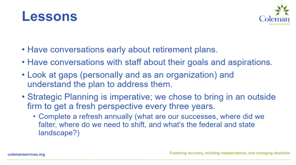 For other organizations looking at executive team retirements, Ms. Tracy and Ms. Carter provided three recommendations for building the succession capacity of their organizations: integrating succession planning into growth strategies, creating psychological safety for honest conversations, and treating internal talent development as a strategic priority.